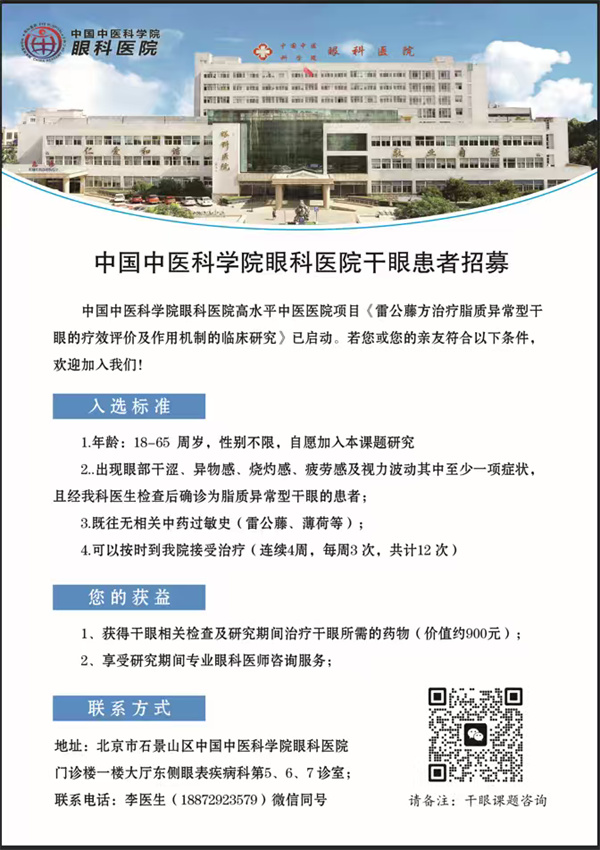 中国中医科学院眼科医院(中国中医科学院眼科研究所)始建于1994年,隶属于中国中医科学院,是国家中医药管理局直属医院之一,是一所集医疗、科研、教学为一体的三级甲等中医专科医院。医院现有职工648人,高级职称107人,硕士及以上学位188人,拥有国医大师、首都国医名师等诸多…